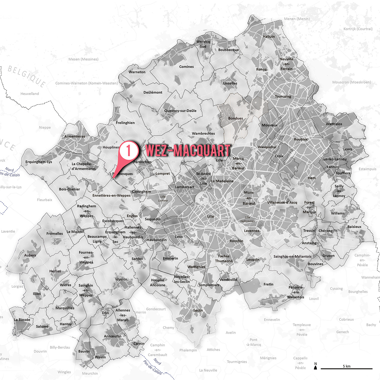 Aux portes des Weppes, le hameau de Wez-Macquart vient incarner cette typologie urbaine de «ville et village durable» tel qu’inscrit au SCOT. Son développement s’est opéré principalement le long des axes de transports et a permis de conserver le parcellaire agricole. Il a la particularité d’appartenir à quatre communes: Chapelles d’Armentières, Houplines, Presmesques et Ennetières-en-Weppes, et de s’inscrire au carrefour de trois d’entre-elles.